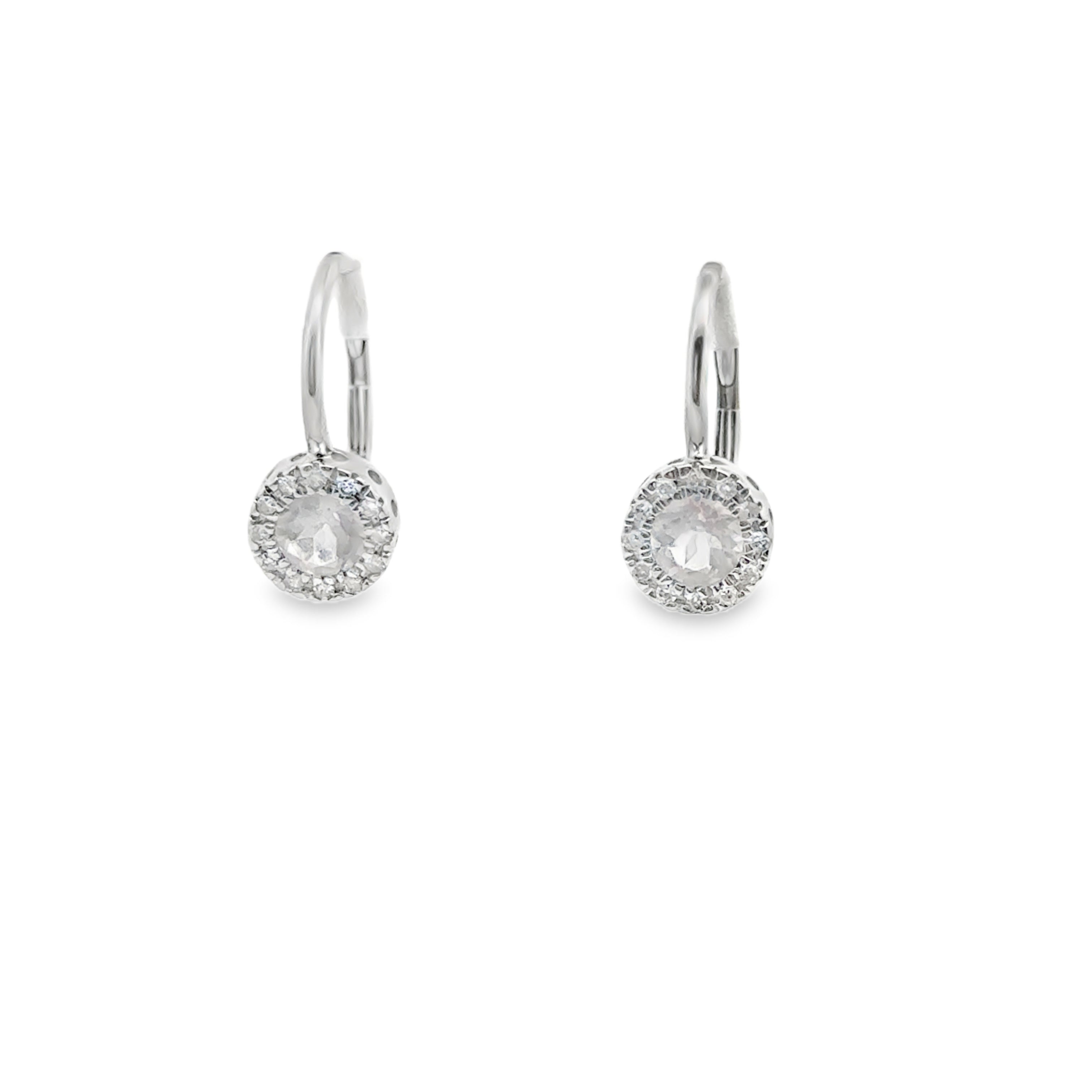 14k white gold round rose quartz with diamond halo drop earrings 0.09ctw