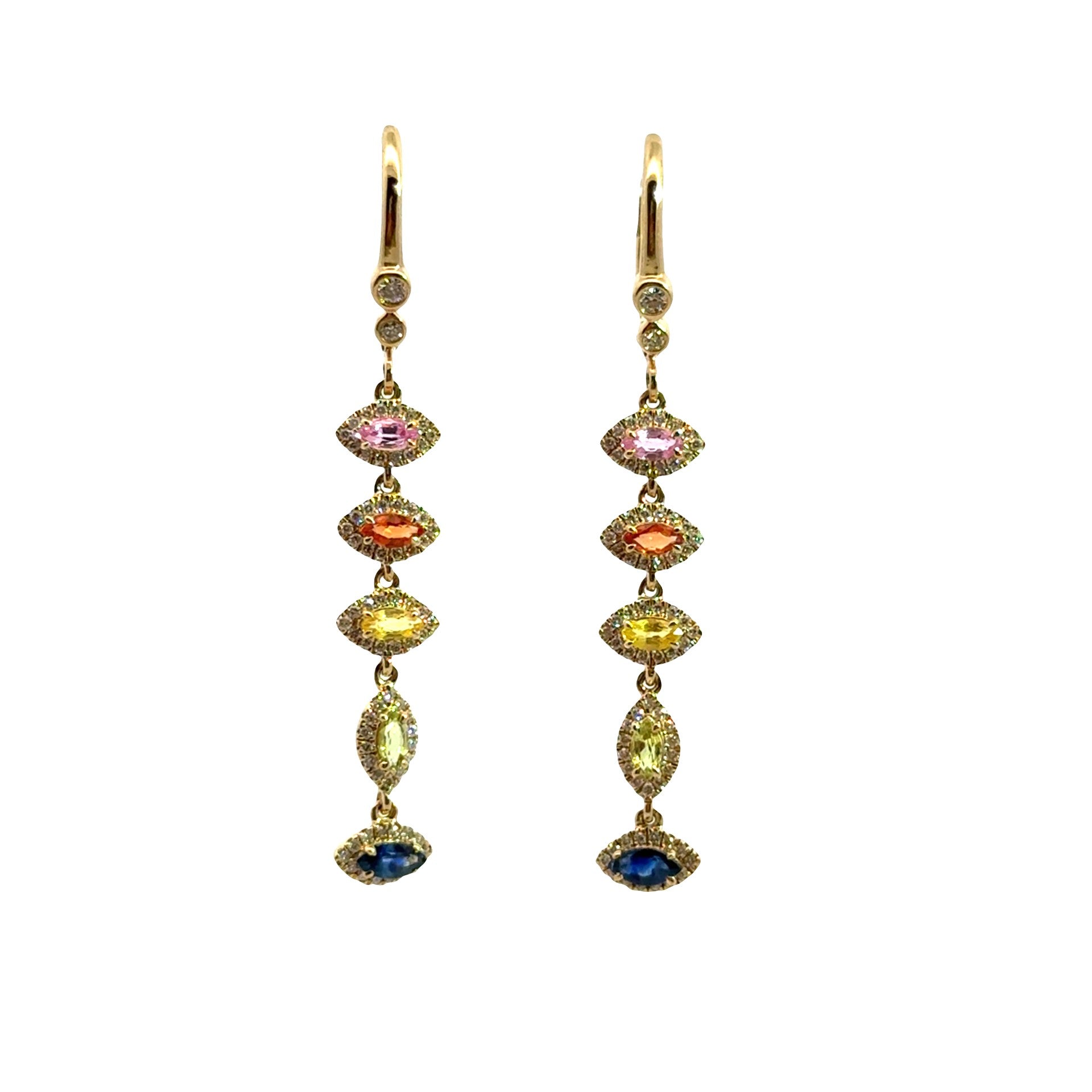 14k yellow gold rainbow sapphire marquise shaped with diamond halo dangle earrings ms 1.81ctw dia 0.48ctw