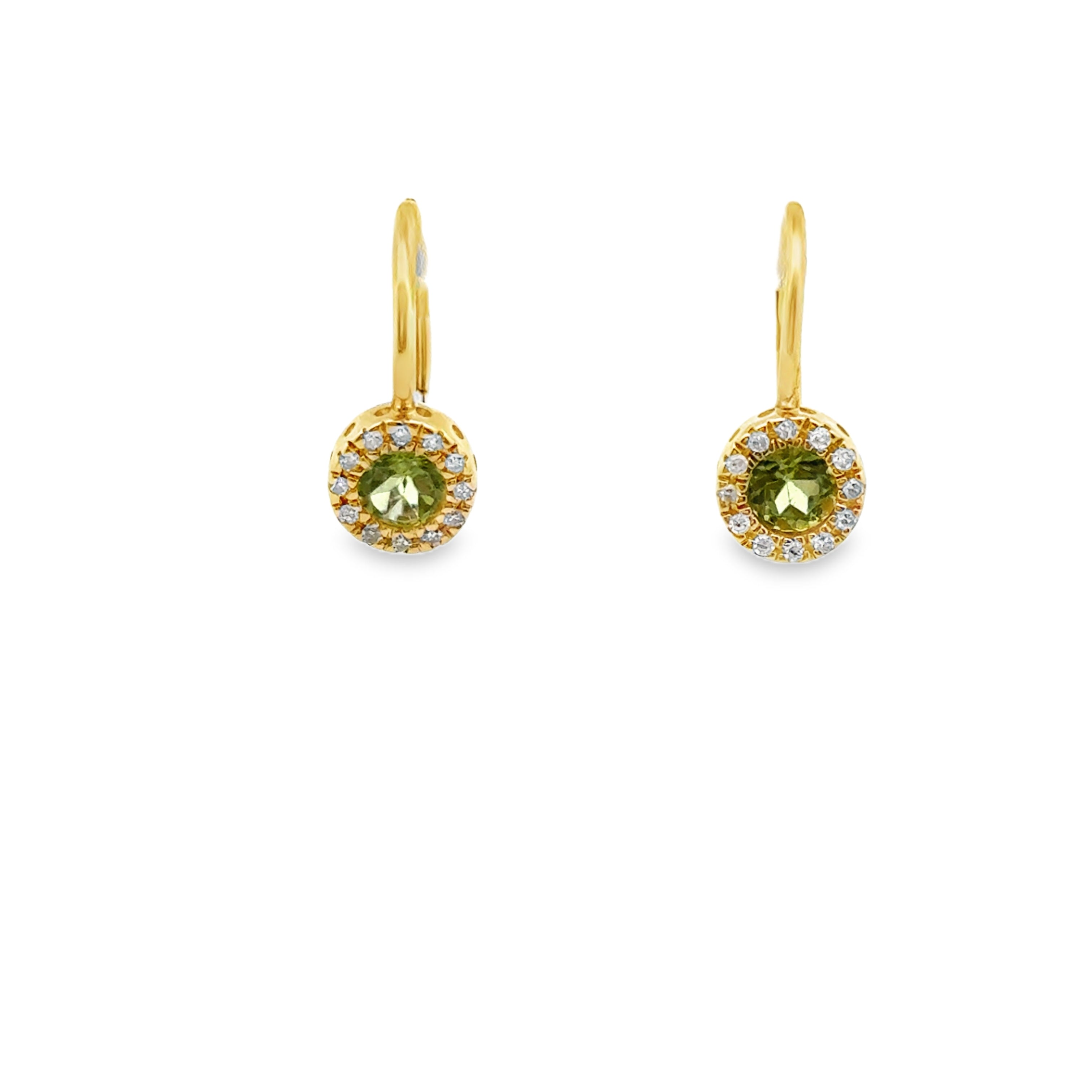 14k yellow gold round peridot with diamond halo drop earrings dia 0.09ctw per 0.64ctw