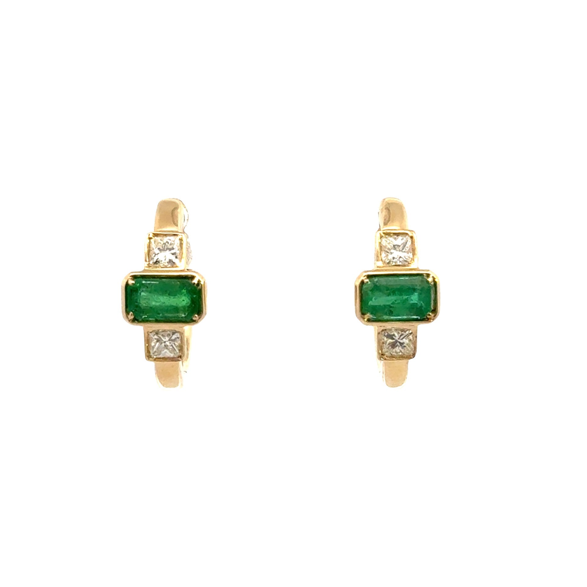 14k yellow gold hoop earrings with bezel set east to west emerald and princess cut diamonds em 0.57ctw dia 0.29ctw