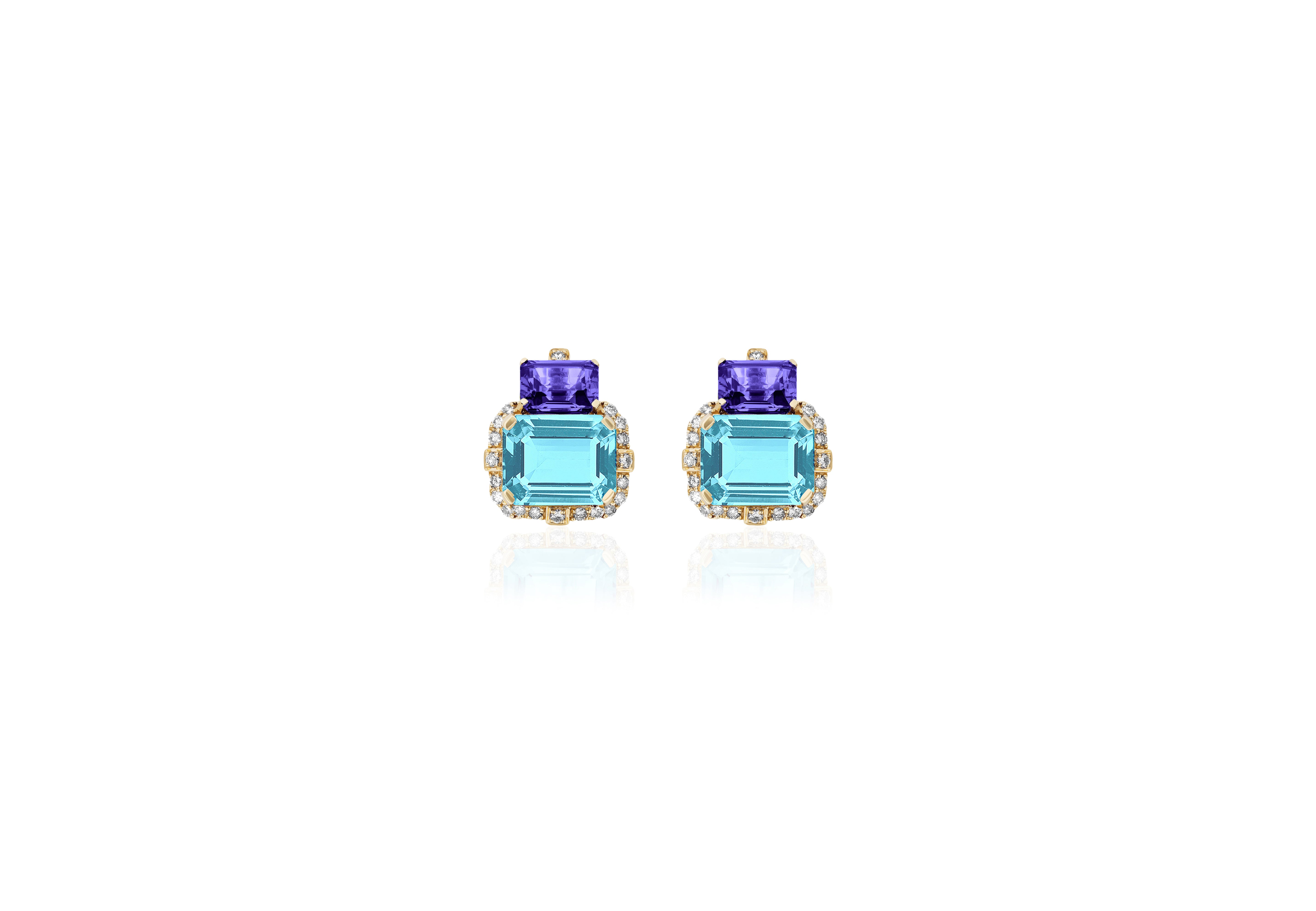 Goshwara 18 yellow gold emerald cut blue topaz and tanzanite with diamond detail earrings bt 8.21ctw tan 1.90ctw dia 0.42ctw