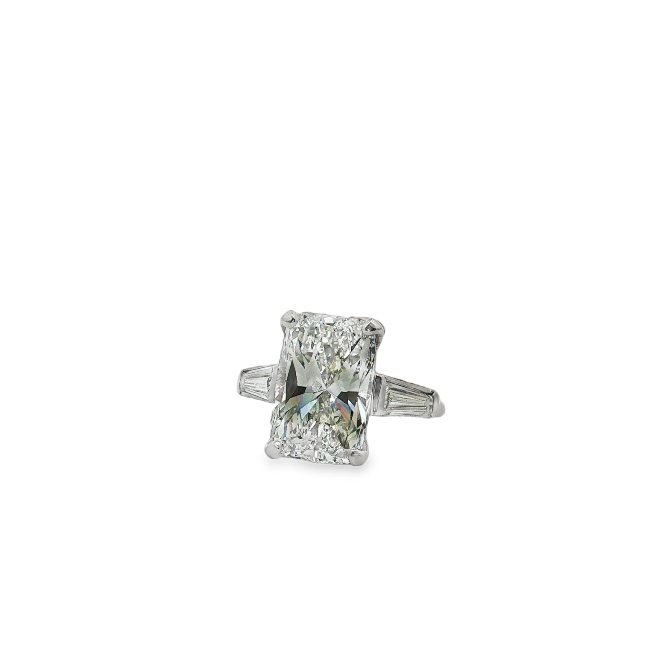 Platinum cushion cut diamond (5.02ctw) with tapered baguette diamond side stones (0.70ctw), size 4.5