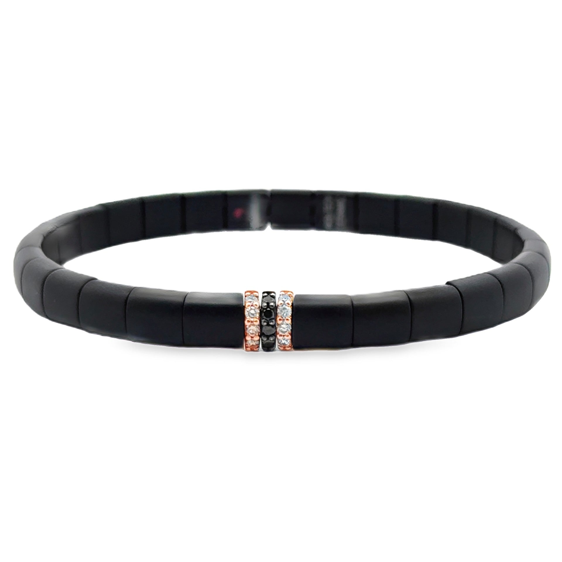 18k yellow rose gold black matte stretch bracelet with 2 champagne rondels and a black diamond rondel