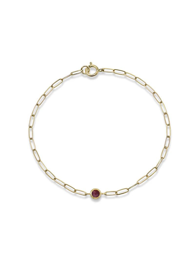 14k yellow gold bezel set ruby on paperclip chain bracelet