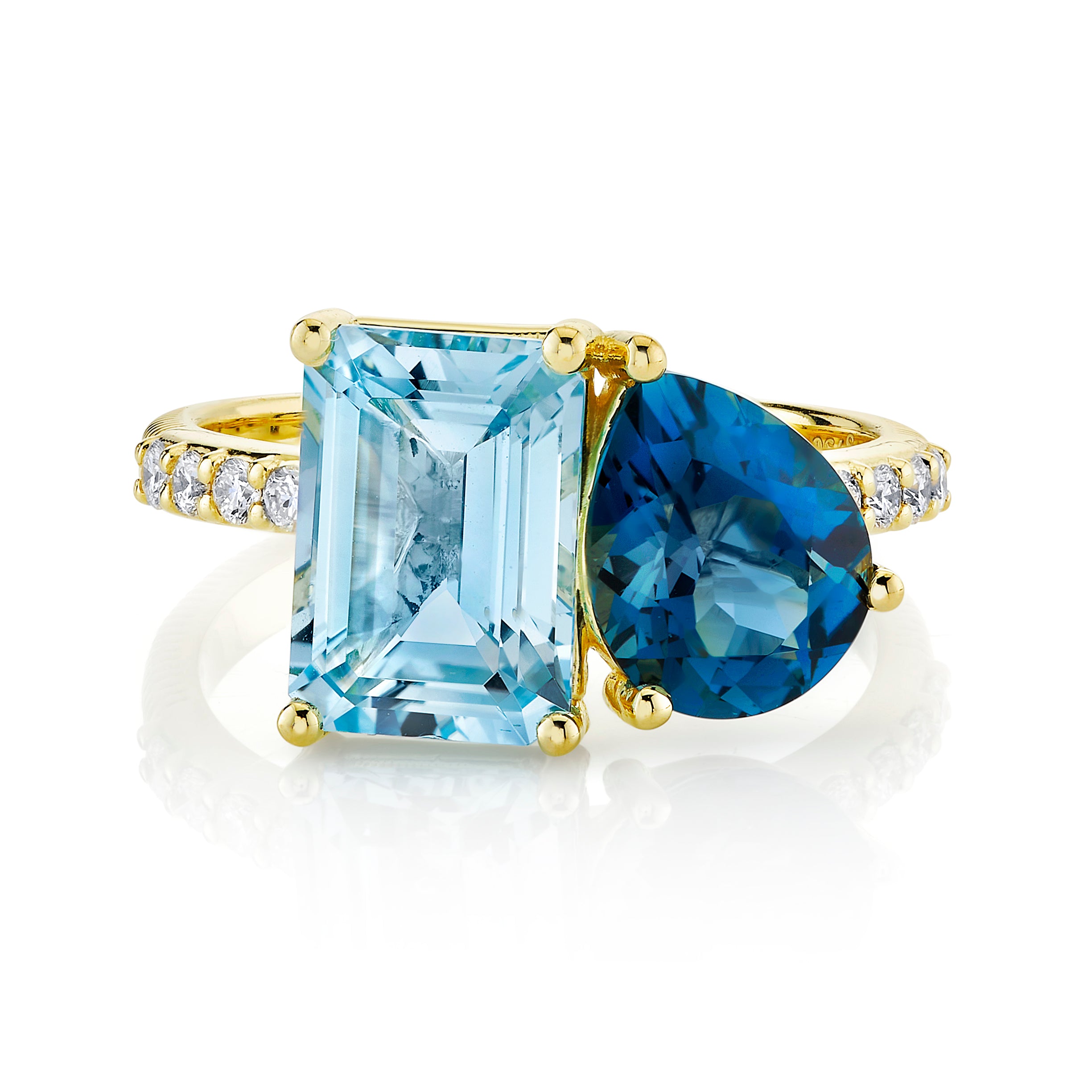 Sloane Street 18k yellow gold emerald cut blue topaz and pear shaped London blue topaz ring