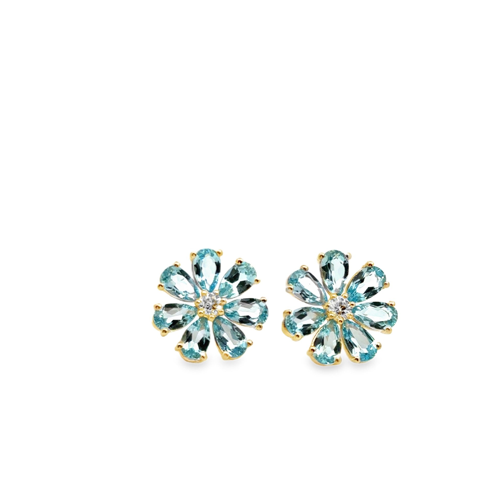 14k yellow gold swiss blue topaz flower earrings with diamond center sb 3.47ctw dia 0.13ctw