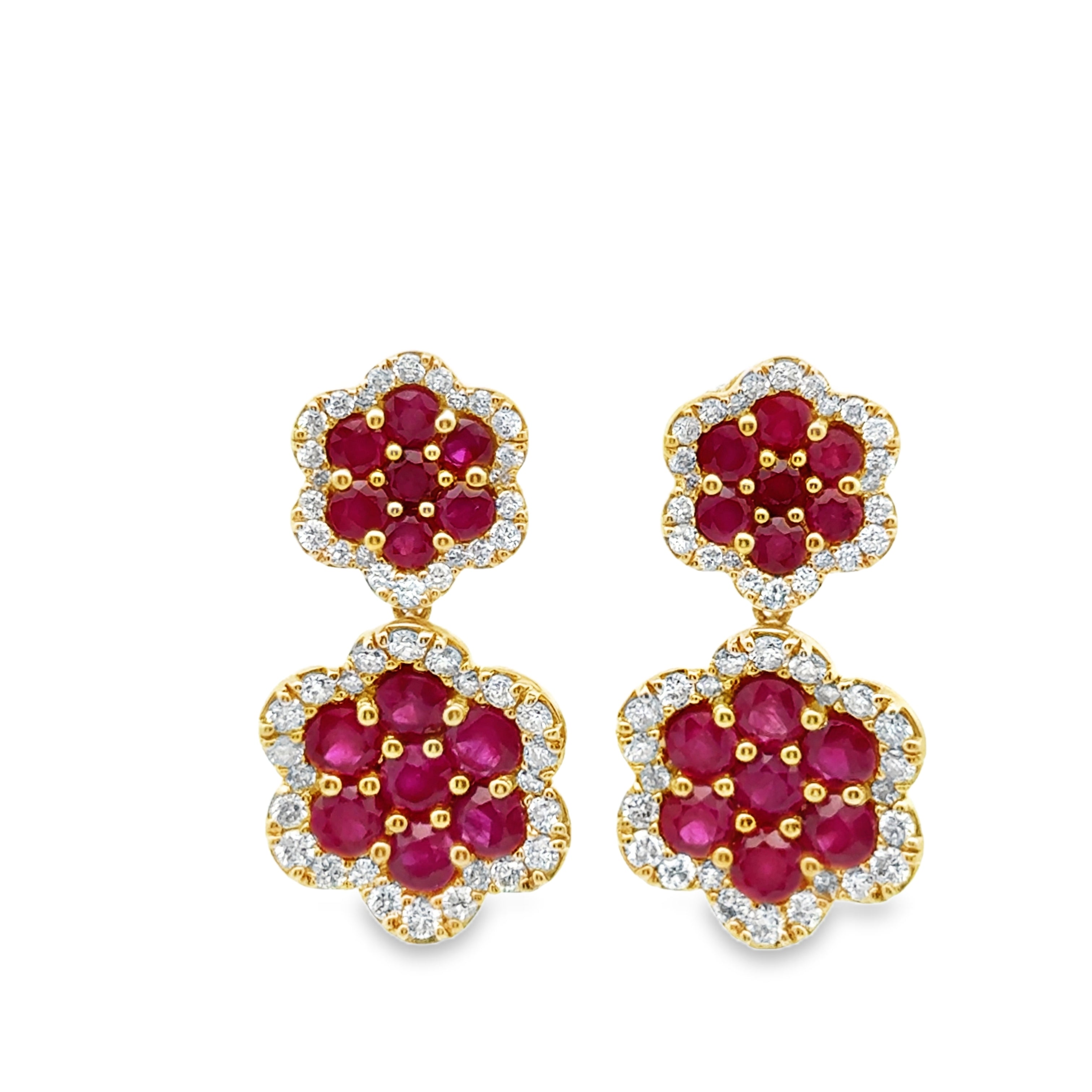 14k yellow gold double ruby and diamond flower drop earrings dia 1.55ctw ru 4.76ctw