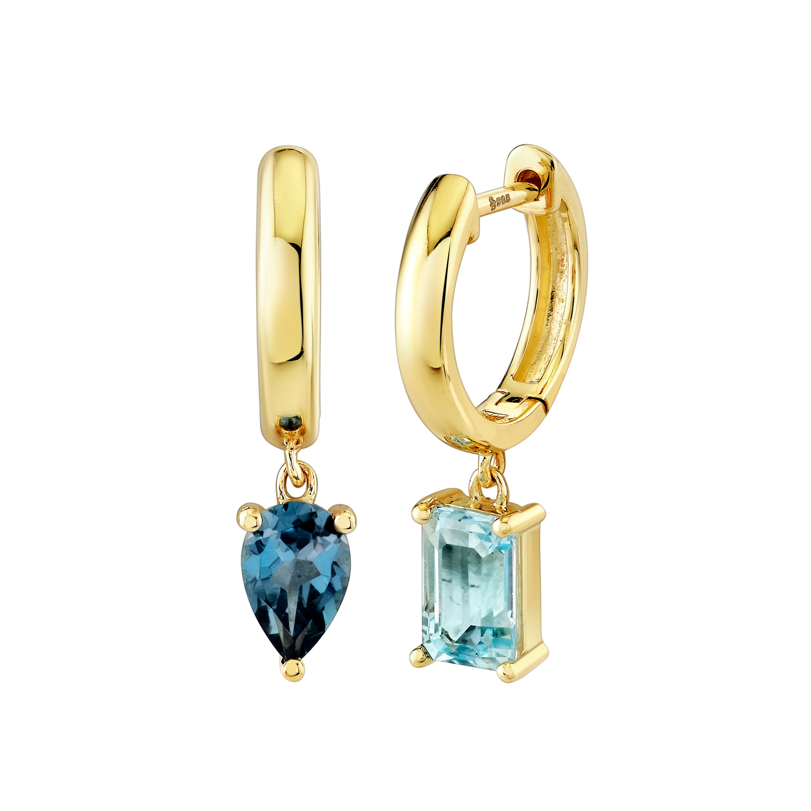 14k yellow gold pear shaped London blue topaz and emerald cut sky blue topaz dangle on gold hoop earrings sb 0.79ctw lb 0.50ctw