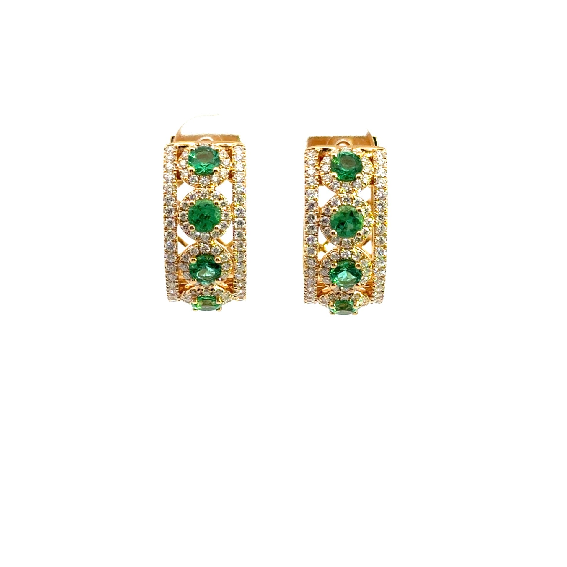 18k yellow gold round emeralds with diamond halo and diamond detail hoop earrings em 1.50ctw dia 1.31ctw