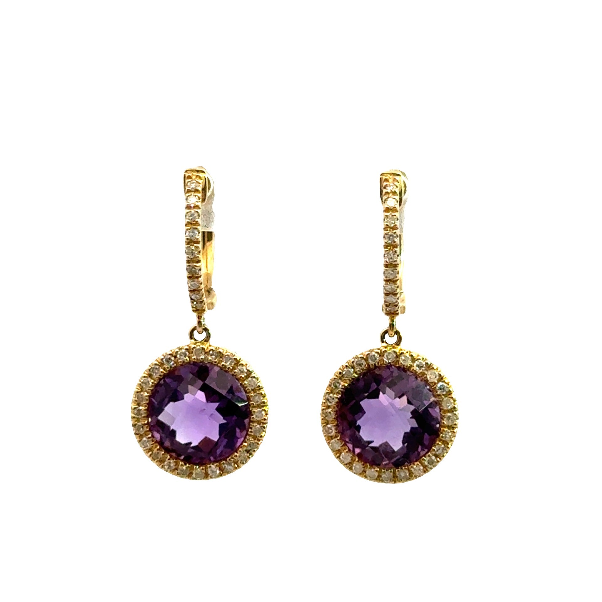 14k yellow gold faceted amethyst with diamond halo drops on diamond huggie earrings dia0.33ctw am 5.19ctw