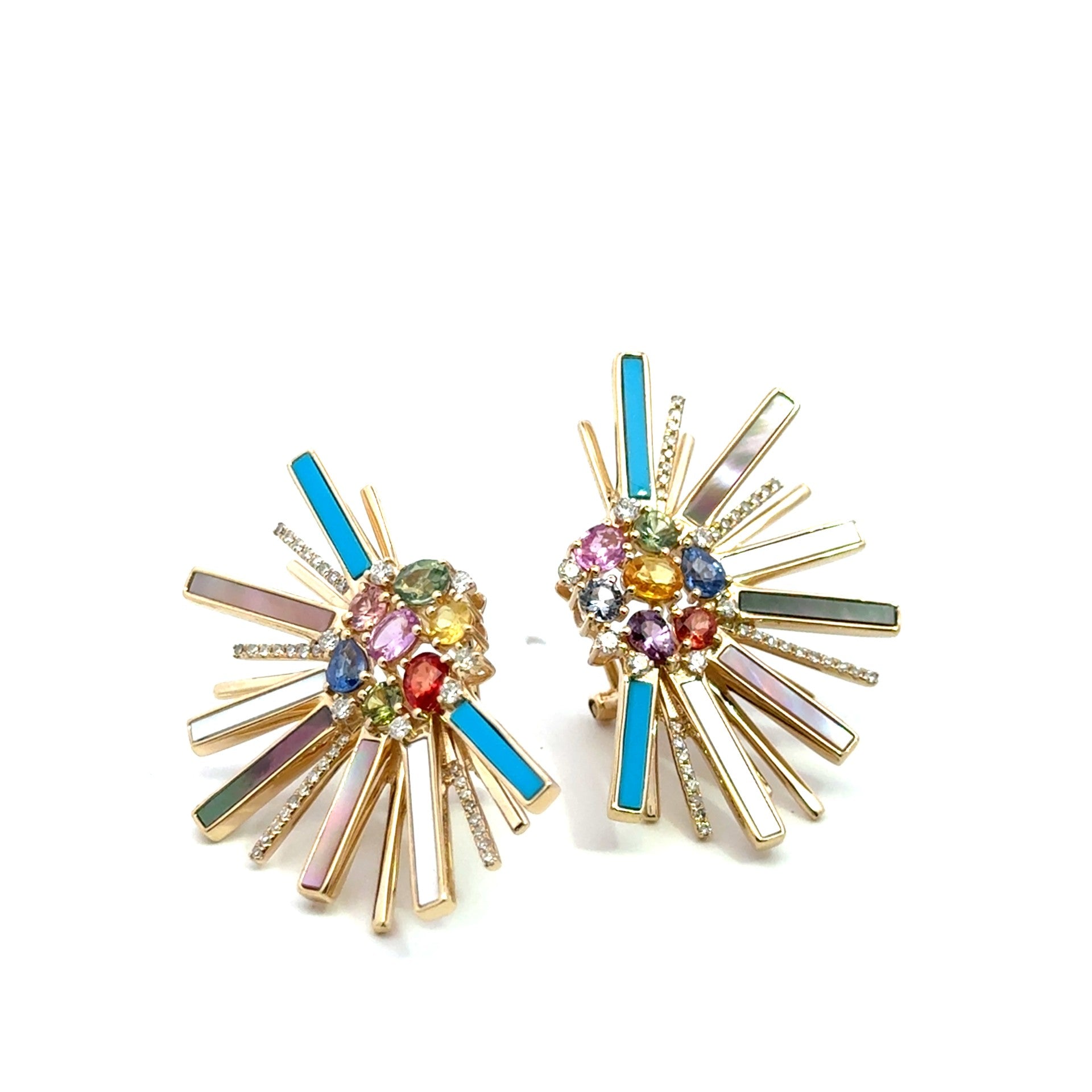 14k yellow gold colored enamel with oval sapphire and diamond starburst earrings dia 0.47ctw ms 2.61ctw