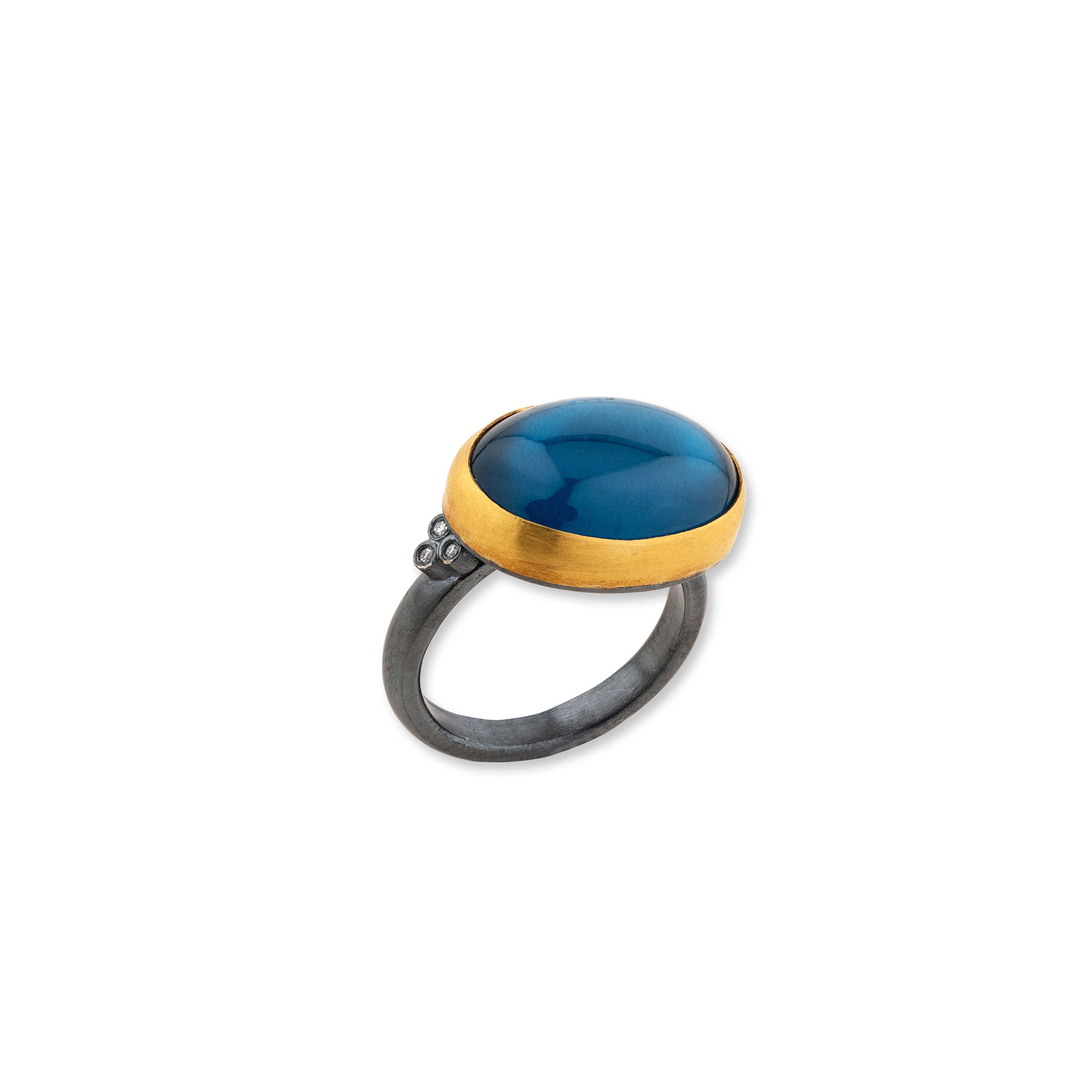 Lika Behar 24k yellow gold and oxidized sterling silver ring with oval cabochon London blue topaz and mother of pearl doublet and diamond detail lb 14.06ctw dia  0.06ctw
