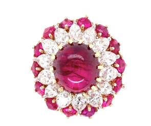 Platinum and 18k yellow gold Burma cabochon ruby ring (4.91CTW) with diamond and ruby detail (diamond 1.50CTW)
