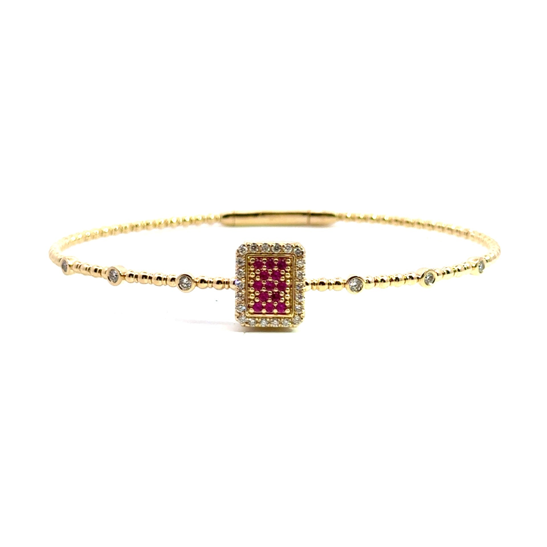 14k yellow gold flexible beaded bracelet with bezel set diamond stations and rectangular flipping sapphire and ruby box with diamond detail