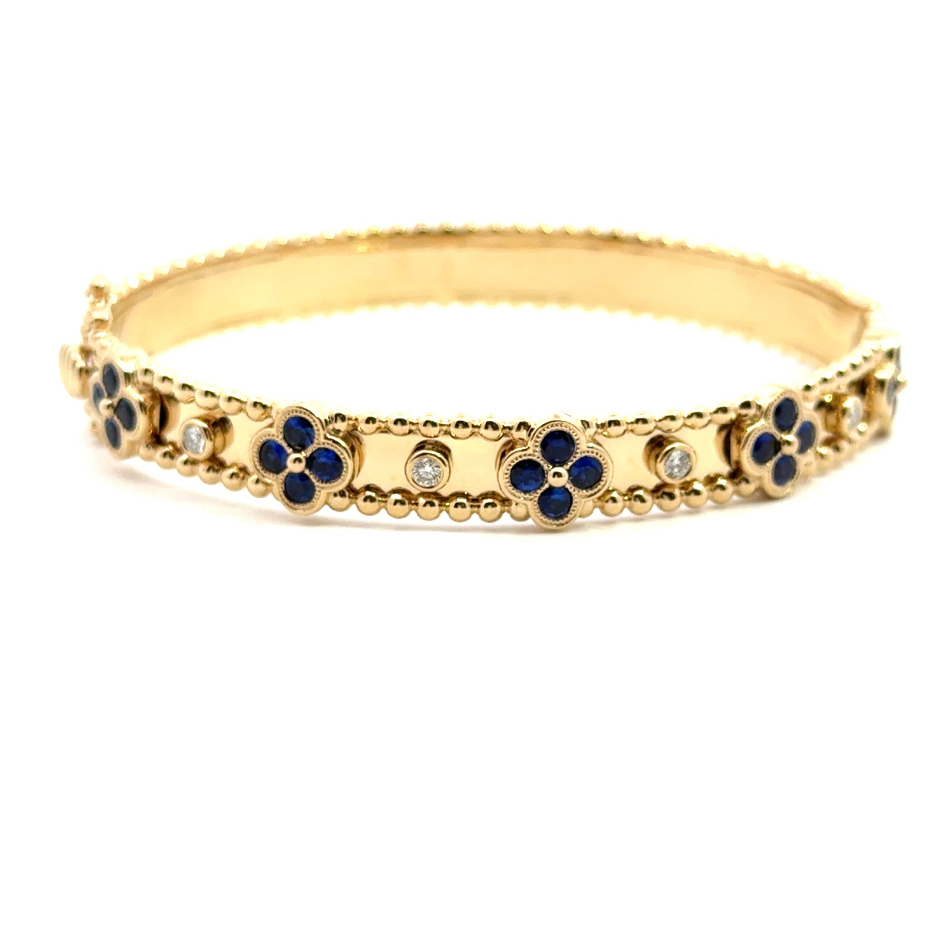 14k yellow gold beaded bangle bracelet with sapphire flowers and diamond stations dia 0.18ctw sap 1.60ctw