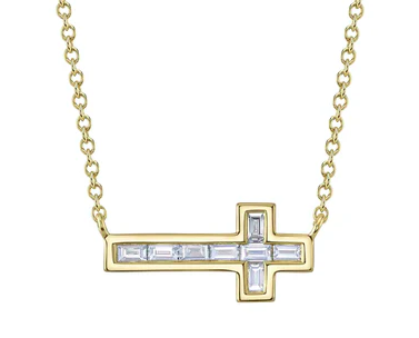 14k yellow gold sideways baguette diamond cross on chain necklace (0.20CTW)