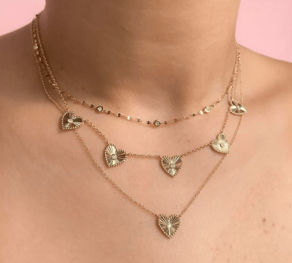 14k yellow gold 5 hearts with diamond center on chain necklace 0.10ctw