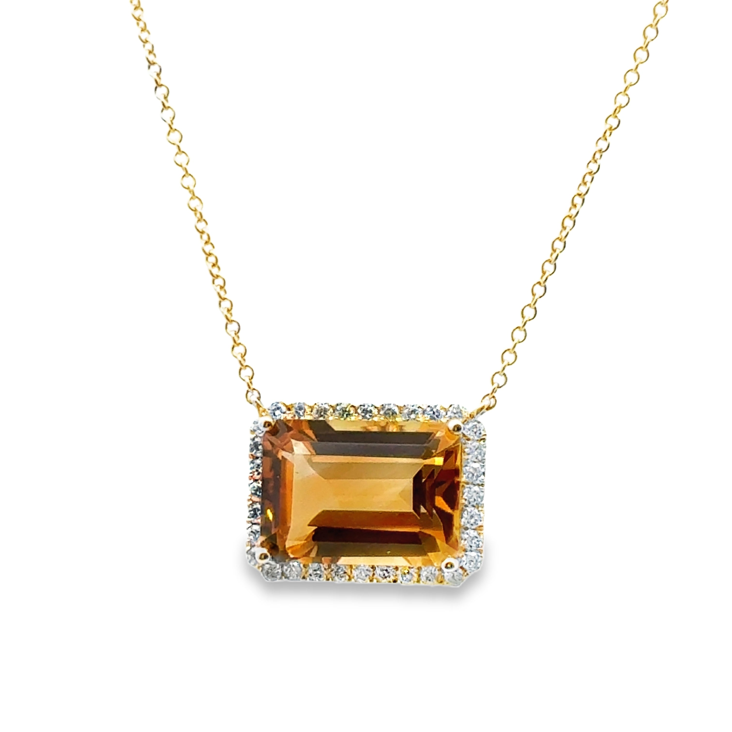 14K yellow gold east to west emerald cut with diamond halo pendant on chain necklace ct 7.32ctw dia 0.38ctw