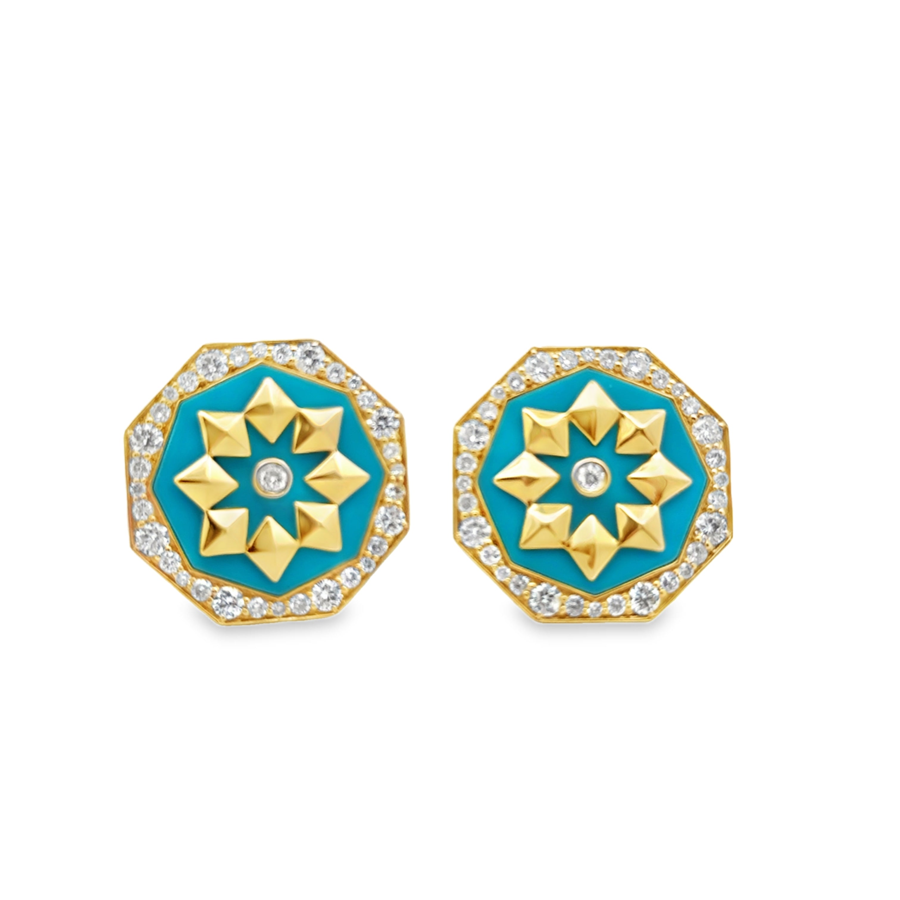 14k yellow gold turquoise octagon with diamond halo and diamond center with gold detail earrings dia 2.22