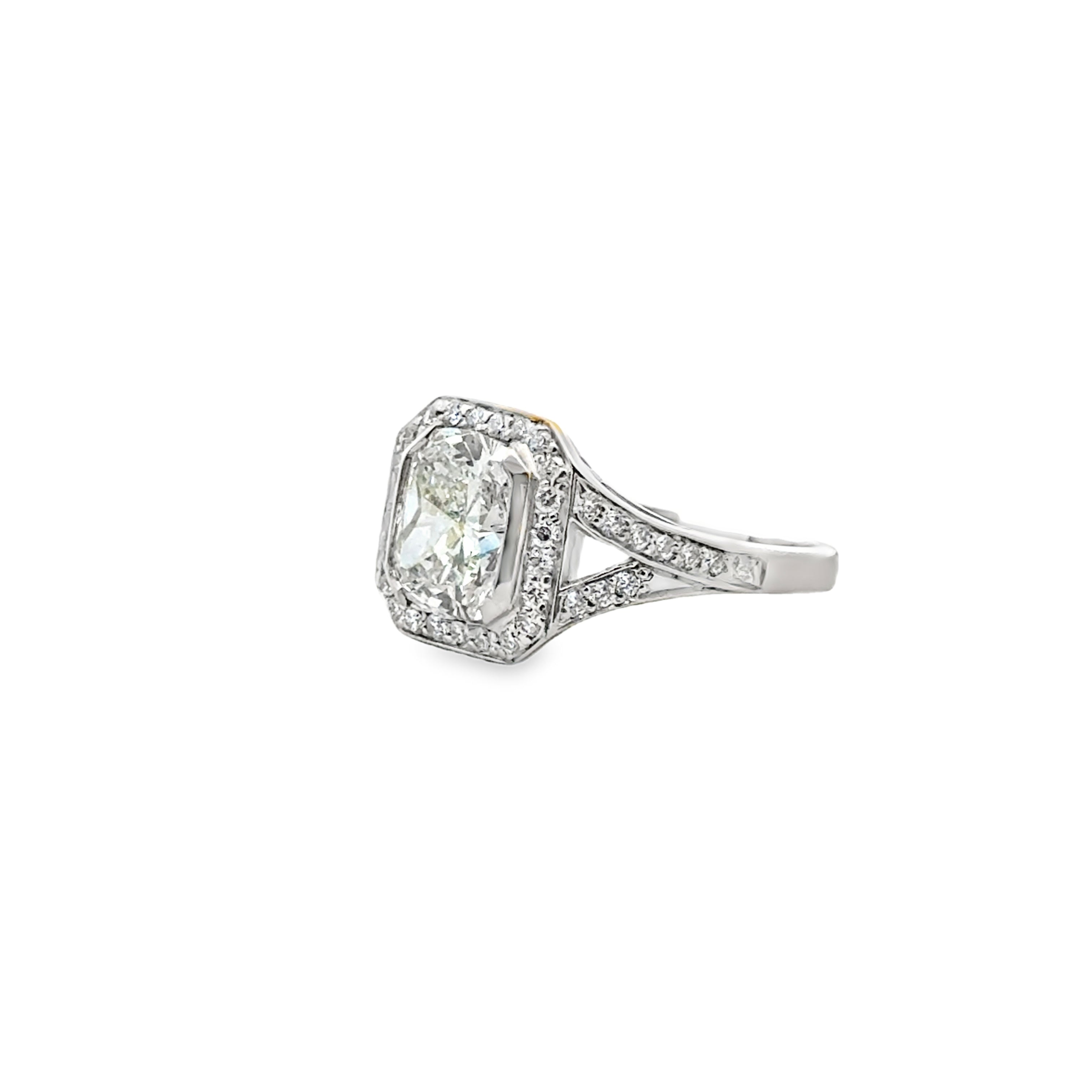 18k white gold cushion cut diamond center stone 3.04ctw J VS1 GIA 2235343469 with diamond halo and split shank ring 0.45ctw