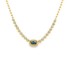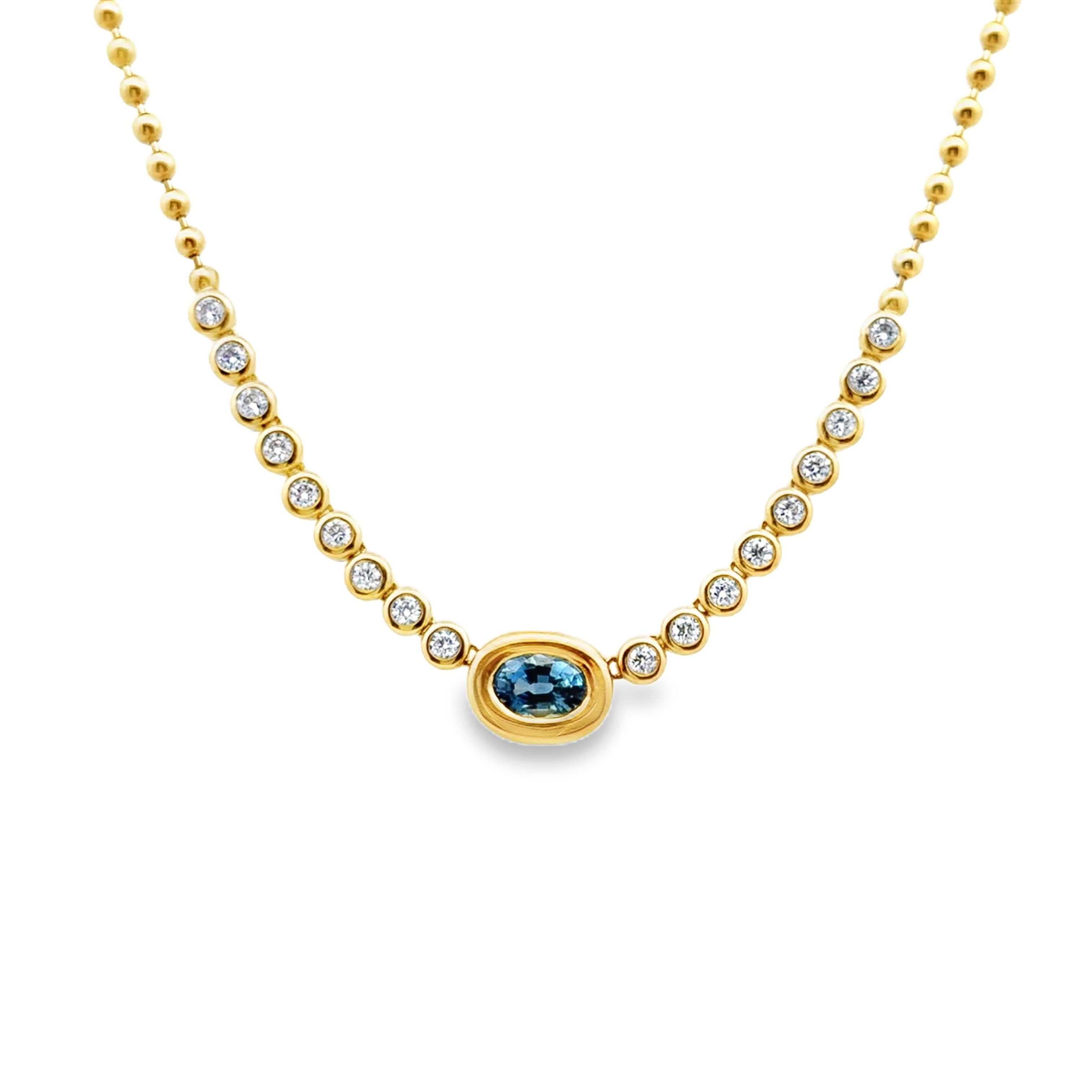 18k yellow gold beaded chain necklace with bezel set diamonds and oval bezel set sapphire sap 0.70ctw dia 0.42ctw