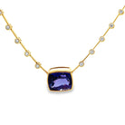 18k yellow gold bezel set diamond bar necklace with a cushion cut tanzanite center stone tz 19.56ctw dia 3.52ctw