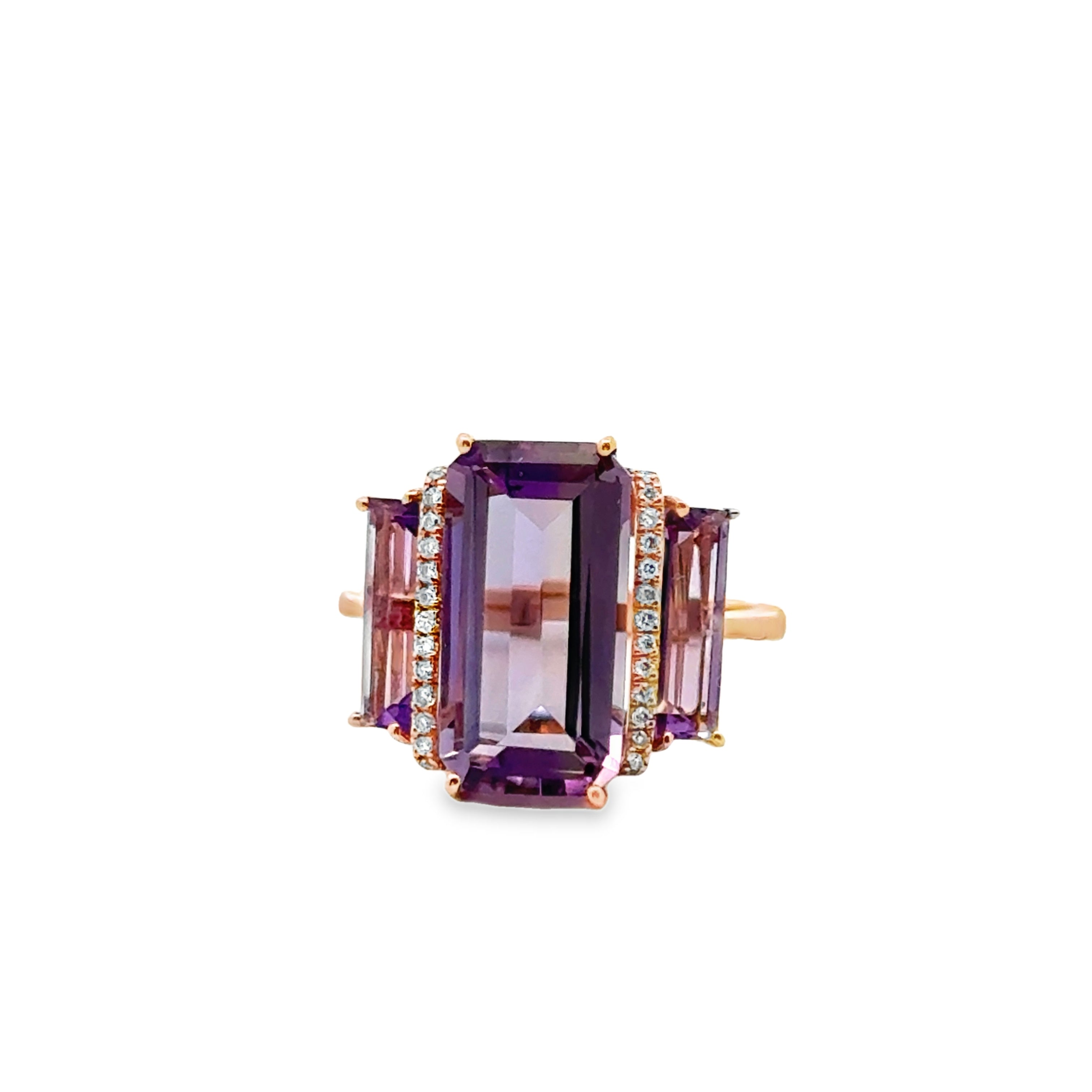 14k rose gold 3 emerald cut amethyst with diamonds set in between ring am 6.32ctw dia 0.09ctw