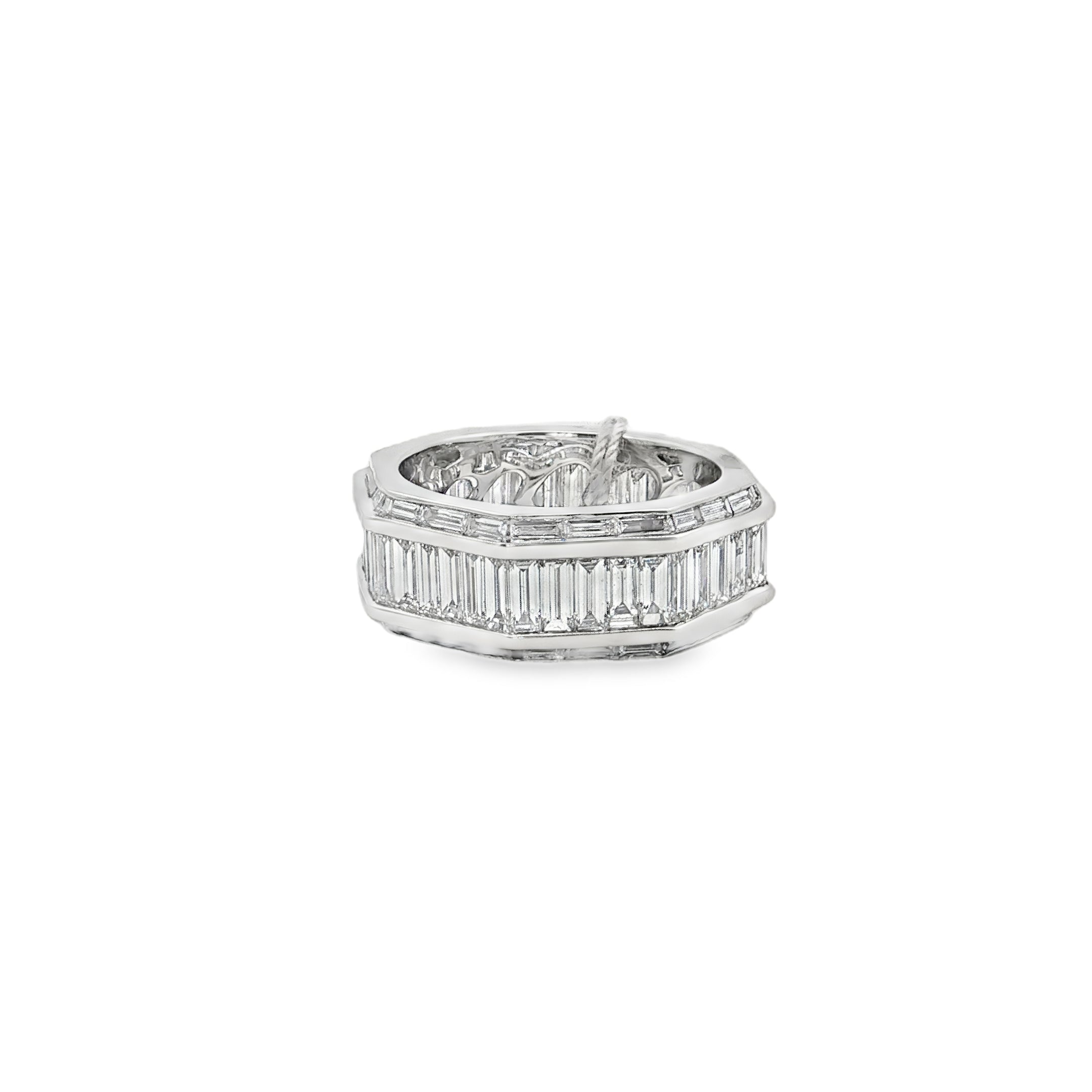 18k white gold octagon shaped eternity ring with baguette diamonds set east to west and north to south 3.85ctw