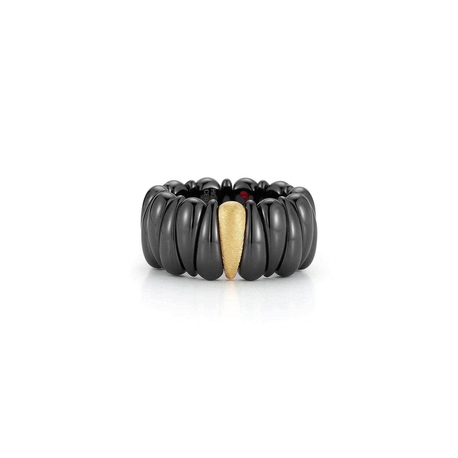 18k yellow gold brushed station on shiny ceramic black stretch ring
