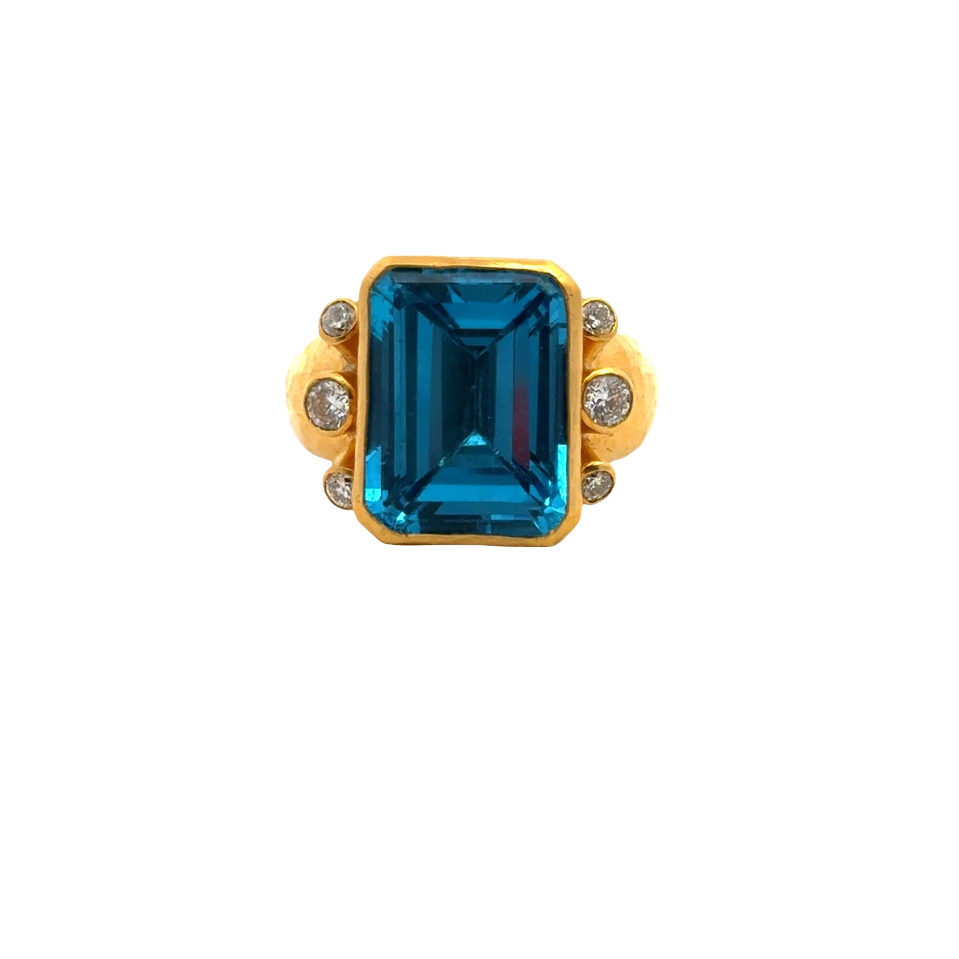 Gurhan 24k yellow gold faceted emerald cut blue topaz with 3 diamonds on the side ring size 6.5 bt 14.57ctw dia 0.504ctw