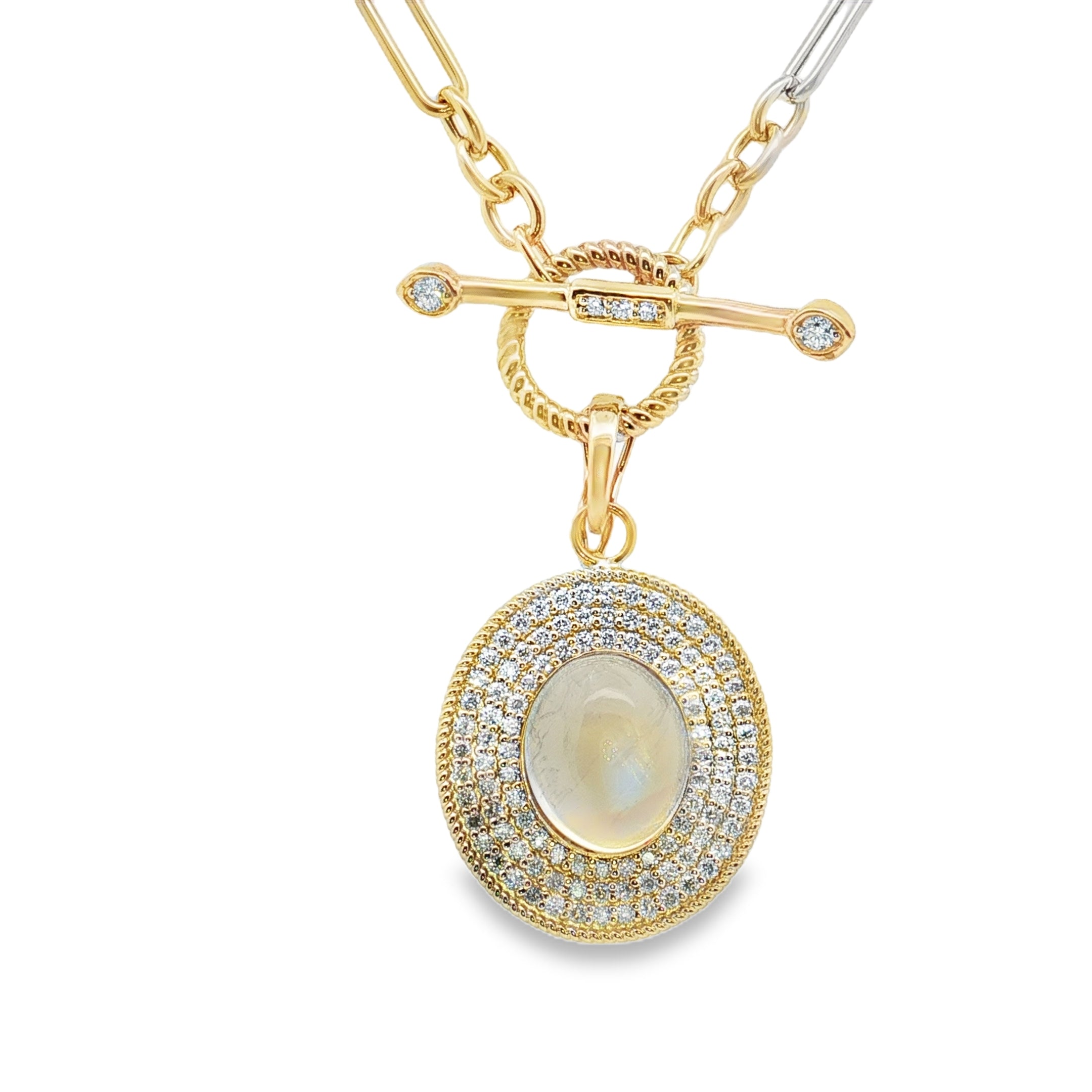 14k yellow gold oblong and round link necklace with diamond detail on toggle and cabochon moonstone and diamond pendant dia 0.87ctw moon 5.78ctw