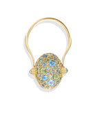 Nanis 18k yellow gold reversable ring with doublette with Mother of pearl and London blue topaz and pavè of blue diamonds, green sapphires and Swiss blue topaz on the flip side